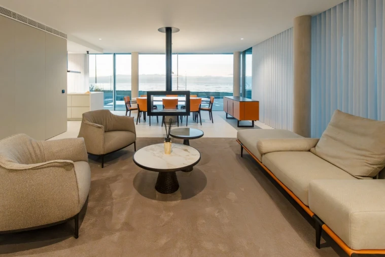 No exterior, sobressaem a piscina de borda infinita, que se prolonga visualmente até ao horizonte marítimo, o jardim privativo e as amplas varandas, perfeitas para momentos de lazer, convívio ou contemplação. Estes elementos reforçam o caráter exclusivo da moradia e elevam a experiência de viver junto ao mar.