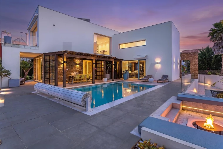 • No exterior, tudo foi pensado para usufruir de um estilo de vida exclusivo, com privacidade e conforto ao longo de todo o ano. O jardim, cuidadosamente mantido por equipa especializada, envolve a piscina e as várias áreas de estar, criando um ambiente resguardado e sereno. Destacam-se a zona de refeições exterior coberta por pérgula, com capacidade para 12 pessoas, a agradável área de lounge com firepit, bem como os terraços e varandas equipados com coberturas automáticas. A piscina beneficia igualmente de sistema de cobertura, reforçando a sua funcionalidade em todas as estações.