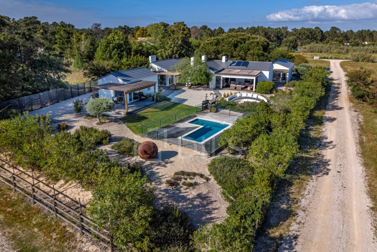 No exterior, destaca-se um jardim com vegetação autóctone, zona de firepit, piscina e carport, proporcionando um ambiente perfeito para desfrutar do estilo de vida descontraído da Comporta.