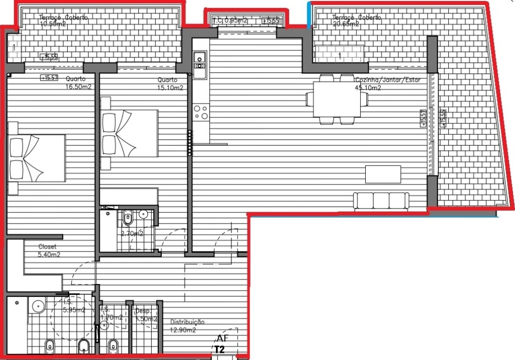 T2 com grandes áreas interiores, grandes varandas+ parqueamento na cave.