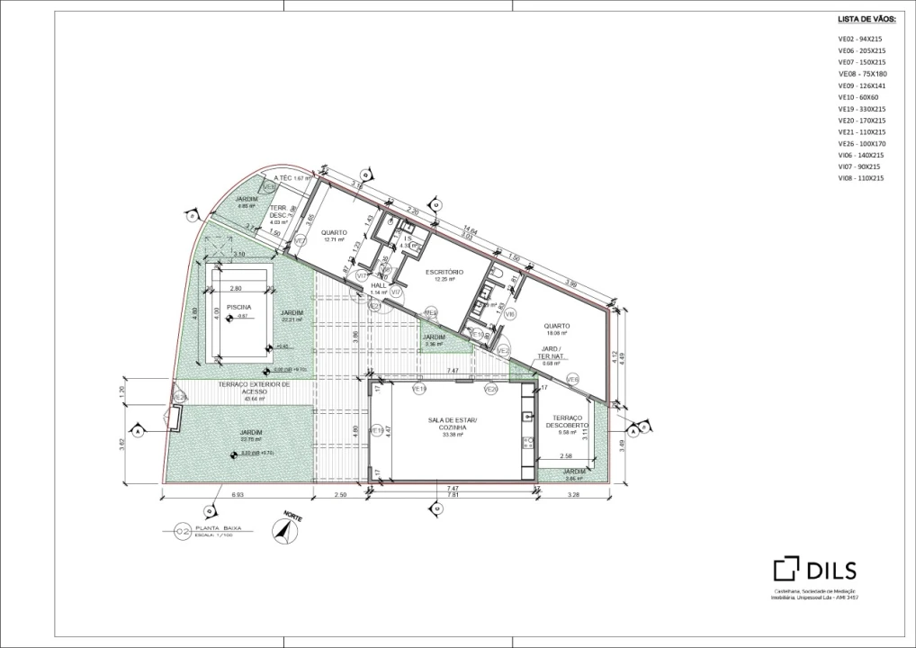 A moradia distribui-se por um bloco principal onde se encontra uma ampla sala de estar e jantar em open space com a cozinha, promovendo luminosidade natural e fluidez entre os ambientes.