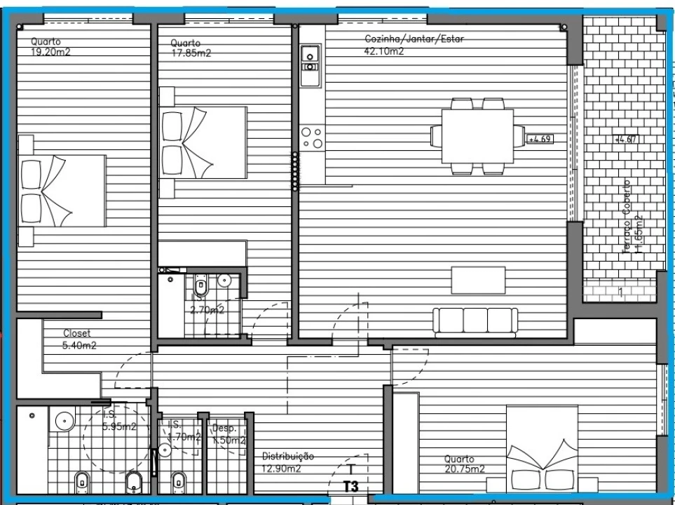 T3 com grandes áreas interiores, grandes varandas+ parqueamento na cave.
