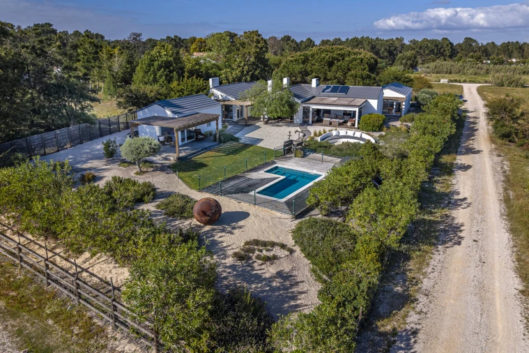 No exterior, destaca-se um jardim com vegetação autóctone, zona de firepit, piscina e carport, proporcionando um ambiente perfeito para desfrutar do estilo de vida descontraído da Comporta.