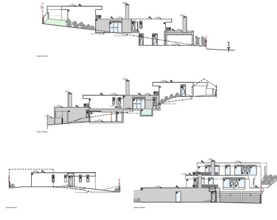 - Hall de Entrada; Cozinha e Sala; 3 Quartos; 4 Casas de Banho; Garagem; Piscina; Arrumos; Zonas Técnicas;