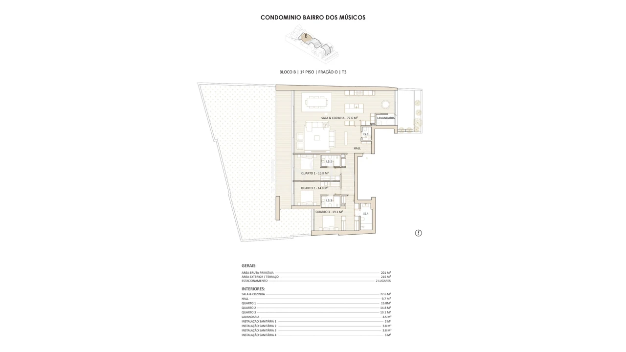Composição e características Com uma área bruta coberta de 202 m² e um jardim privativo com 214 m², esta fração foi pensada para uma vivência familiar confortável, onde o exterior assume um papel central no dia a dia. A área social apresenta uma organização fluida e bem definida, com sala de estar e sala de jantar em ligação direta ao jardim, potenciando a luz natural ao longo do dia graças à orientação sul e poente. A cozinha, de dimensões generosas, apresenta acabamento em madeira, tampo em material tipo corian e encontra-se totalmente equipada com eletrodomésticos encastrados de gama Bosch ou equivalente, assegurando funcionalidade e durabilidade. A área social integra um WC de serviço e uma lavandaria, soluções que acrescentam praticidade ao dia a dia e valorizam a organização da casa. A zona privativa é composta por três suites, todas com roupeiros embutidos e casas de banho privativas, garantindo conforto, privacidade e uma organização adequada a uma vivência familiar exigente. As áreas sociais e privadas contam com pavimentos em madeira maciça, reforçando conforto e continuidade visual. As instalações sanitárias recorrem a materiais de qualidade superior, com soluções cuidadosamente selecionadas para assegurar conforto, resistência e coerência estética em todos os espaços. O apartamento dispõe ainda de caixilharia em alumínio com vidro duplo e ruptura térmica, estores elétricos, porta de segurança e bomba de calor para aquecimento de águas sanitárias, integrando soluções eficientes e atuais. Inclui igualmente dois lugares de estacionamento e arrumos, assegurando total comodidade no quotidiano.