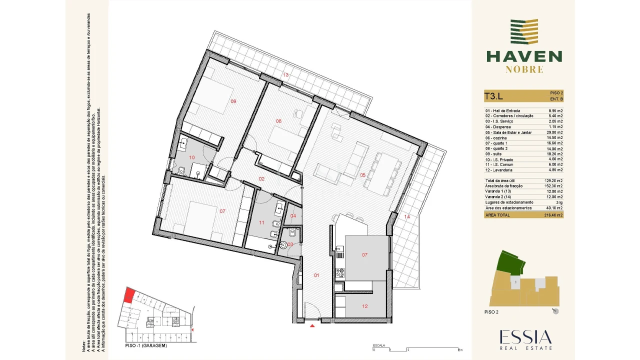 Composição e características do imóvel A zona social assume um papel central na vivência da casa. A sala de estar e jantar articula-se com uma cozinha ampla, criando um ambiente funcional e confortável para o dia a dia. Esta área beneficia de ligação direta ao exterior através de uma varanda principal, que prolonga a utilização da habitação e reforça a entrada de luz natural. A cozinha é complementada por uma despensa lavandaria independente, permitindo maior organização e apoio à rotina diária. A entrada faz-se por um hall acolhedor, com circulação bem definida entre as diferentes áreas da casa. Esta organização contribui para uma separação clara entre a zona social e a zona mais reservada do apartamento. Na área privativa, o imóvel dispõe de três quartos, oferecendo uma solução versátil para família, quarto de hóspedes ou espaço de trabalho. A suite inclui closet e instalação sanitária privativa, garantindo maior conforto e privacidade. Existe ainda uma instalação sanitária comum e uma instalação sanitária de serviço, reforçando a funcionalidade do apartamento. A fração conta também com uma segunda varanda, acrescentando mais uma zona exterior com potencial de utilização quotidiana. Inclui ainda dois lugares de estacionamento. O apartamento integra um conjunto de acabamentos e soluções técnicas orientadas para o conforto e eficiência, nomeadamente pavimento SPC, caixilharia com corte térmico e vidro duplo, estores elétricos blackout nos quartos, iluminação LED, sistema de AQS por bomba de calor ou painéis solares e pré-instalação para carregamento de veículos elétricos. A cozinha inclui eletrodomésticos Bosch encastrados, bancada em compacto mineral Krion e torneiras Grohe. As instalações sanitárias contam com loiças suspensas Sanindusa, base de duche embutida, resguardo em vidro temperado e torneiras Bruma.