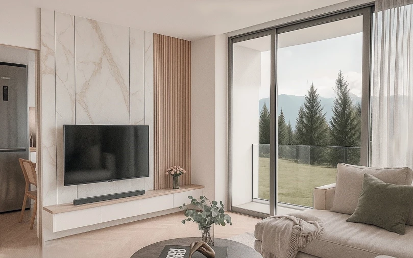 Os apartamentos apresentam acabamentos modernos e materiais de qualidade, incluindo pavimentos vinílicos de elevada durabilidade, cozinhas equipadas com eletrodomésticos de marca reconhecida, casas de banho com louças suspensas e soluções de eficiência hídrica. A caixilharia em PVC com vidro duplo contribui para um excelente isolamento térmico e acústico.