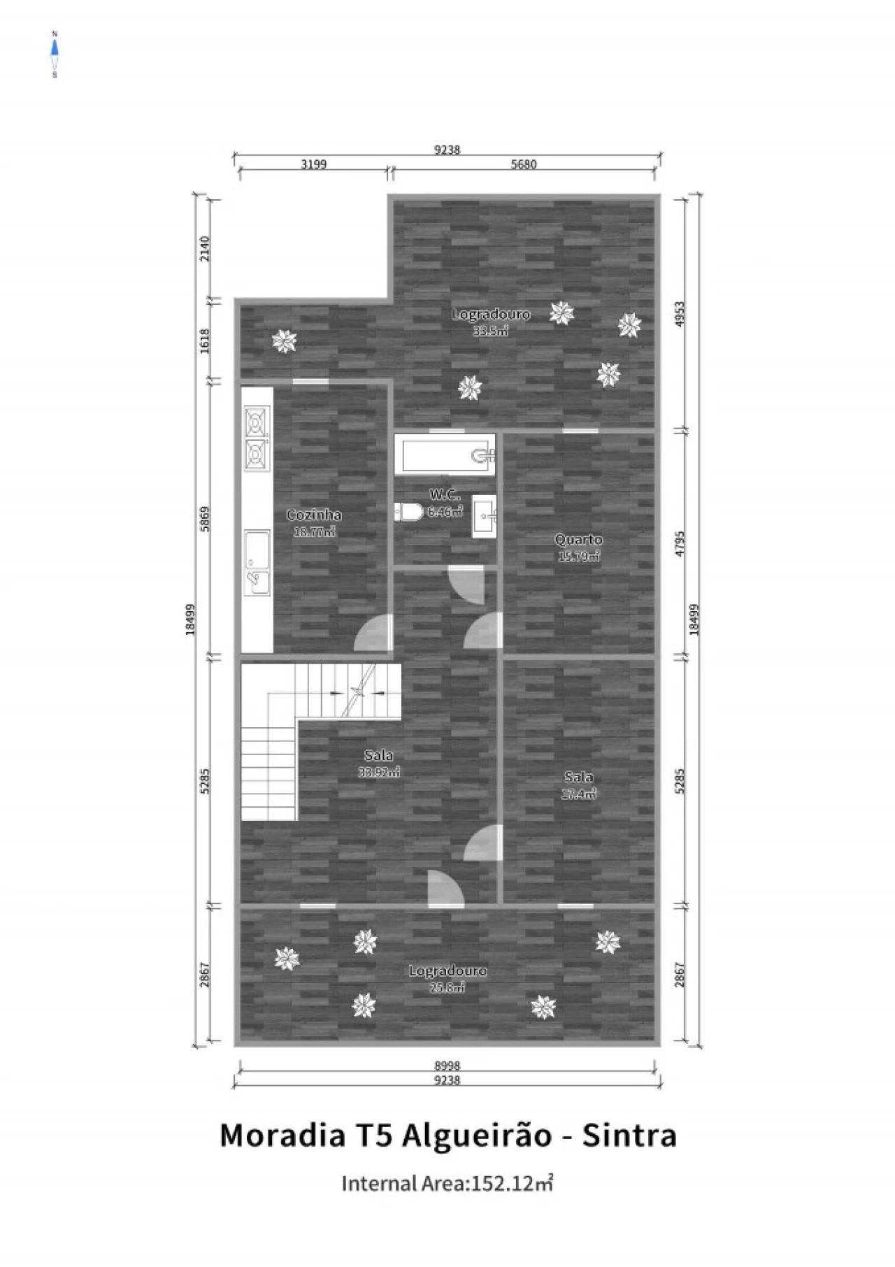 Distribuída por dois pisos, a propriedade oferece uma estrutura generosa e versátil, composta por cinco quartos, duas salas com boa exposição solar, uma cozinha e duas casas de banho. A configuração atual permite múltiplas possibilidades de reabilitação e adaptação, seja para habitação própria, mercado de arrendamento ou revenda com valorização significativa.