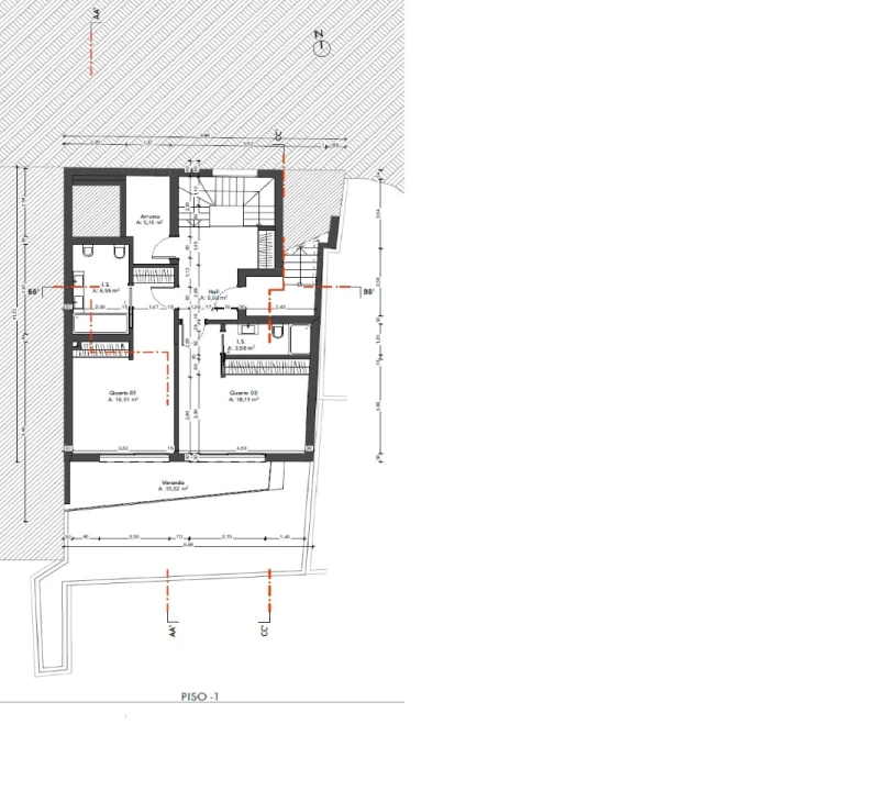 No piso superior situa-se a zona privada. O hall de acesso aos quartos, com 9,53 m², dispõe de roupeiro embutido, não tendo ligação direta à zona de arrumos. Existe ainda uma divisão independente de arrumos com 5,15 m², oferecendo uma solução prática de organização. O imóvel conta com duas suítes, ambas com roupeiros embutidos e acesso direto a uma varanda comum com 10,52 m², garantindo boa luminosidade e ligação ao exterior.