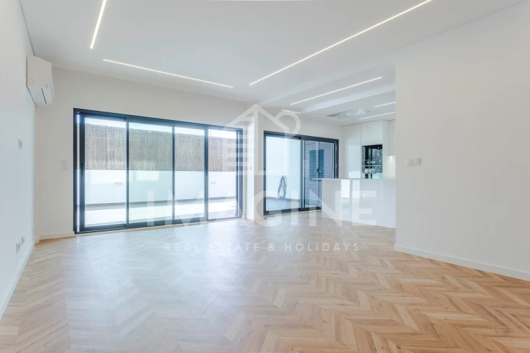 Em termos de equipamentos e acabamentos, o apartamento encontra-se equipado com bomba de calor de 300 litros para aquecimento de águas, ar condicionado LG em todas as divisões e sistema de aspiração central. A caixilharia em alumínio Strugal assegura um bom desempenho térmico e acústico. Destacam-se ainda os tetos falsos com iluminação LED em todo o imóvel, as portas até ao teto, que reforçam a sensação de amplitude, e os estores elétricos em tons cinza, que complementam a estética contemporânea.