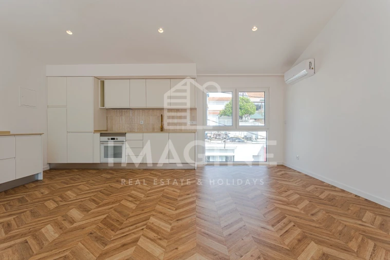 Distribuído por dois pisos, o imóvel permite uma separação clara entre a zona social e a área privada. A sala e a cozinha desenvolvem-se em open space, com uma área total de 24,85 m², beneficiando de boa luminosidade natural através de janelas de grandes dimensões. A cozinha dispõe de móveis termolaminados em tom creme e encontra-se equipada com forno, placa de indução e exaustor da marca Teka, oferecendo um ambiente simples, moderno e funcional.