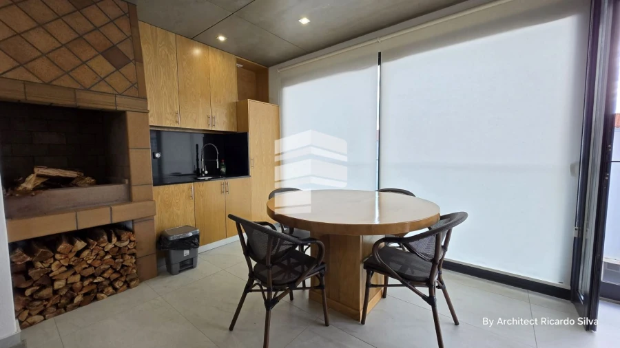 Com uma área bruta de 233.65m2, este imóvel é composto por Hall de entrada (4m2), sala comum (38.35m2), cozinha (15.03m2), lavandaria (2.64m2), hall para os quartos (5.52m2), suite (15.48m2), casa de banho da suite (8.57m2), closet (7.12m2), quarto 2 (13.67m2), quarto 3 (13.83m2), casa de banho comum (5.10m2), casa de banho social (2.51m2), arrumos (1.57m2), churrasqueira (1.99m2), alpendre (36.45m2), terraço (21.67m2), terraço norte (10.15m2), possui ainda 3 lugares de estacionamento em box.