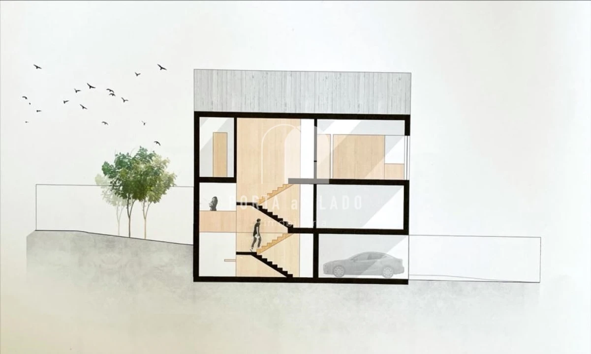 A moradia terá uma área bruta de construção de 300m², distribuída por três pisos bem organizados e com excelente exposição solar: