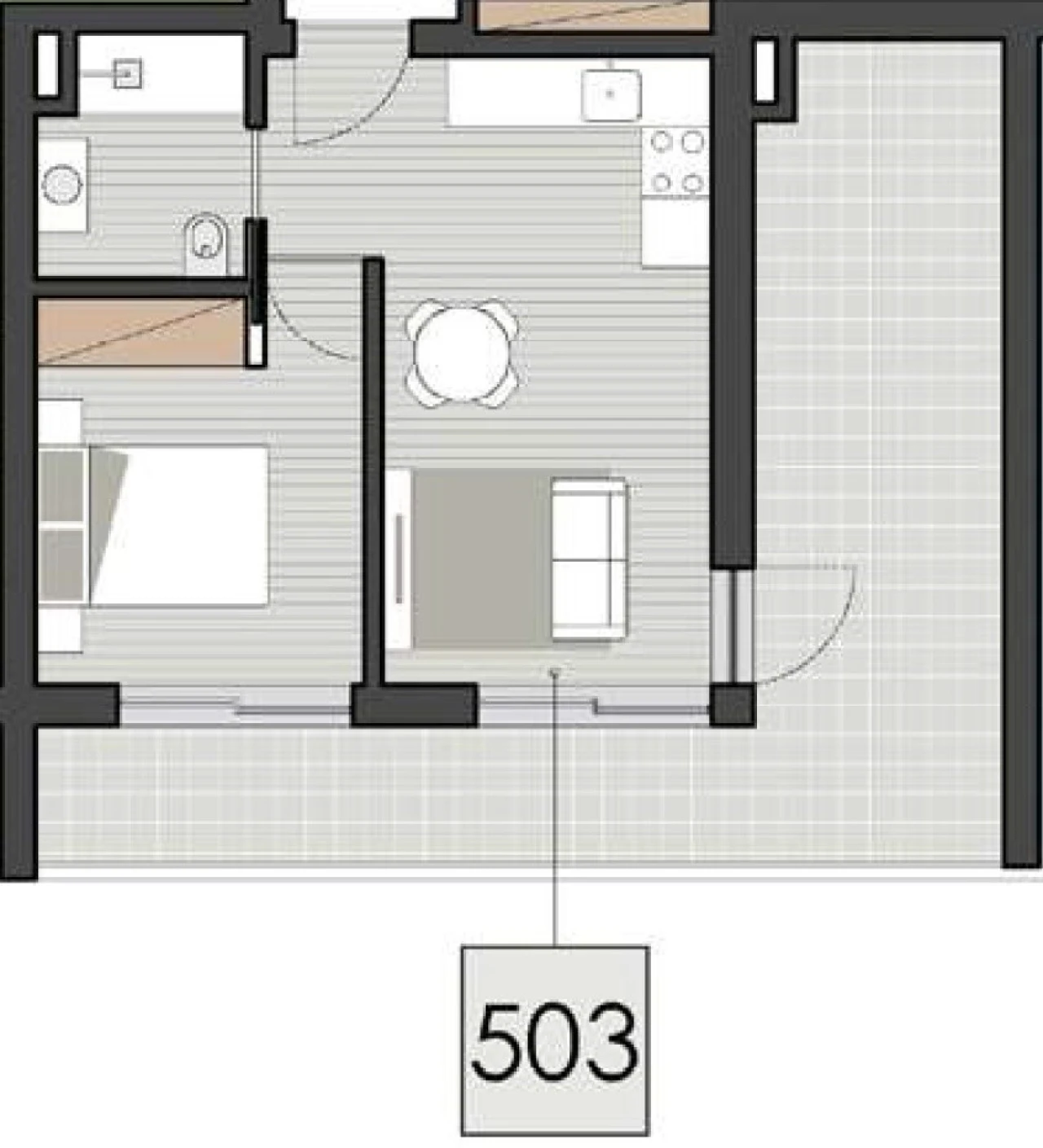 T1 com boas áreas, composto por quarto, casa de banho, sala e cozinha em open space, e terraço com 23,6 m².