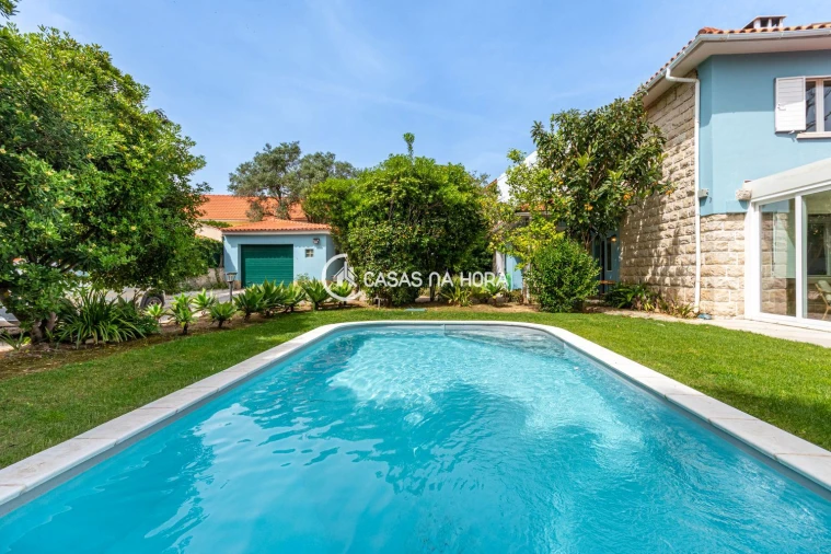 No exterior, o imóvel oferece um jardim cuidado e uma piscina privativa, ideais para momentos de lazer e convívio. A envolvente garante privacidade, sendo um espaço adequado para usufruir durante todo o ano.