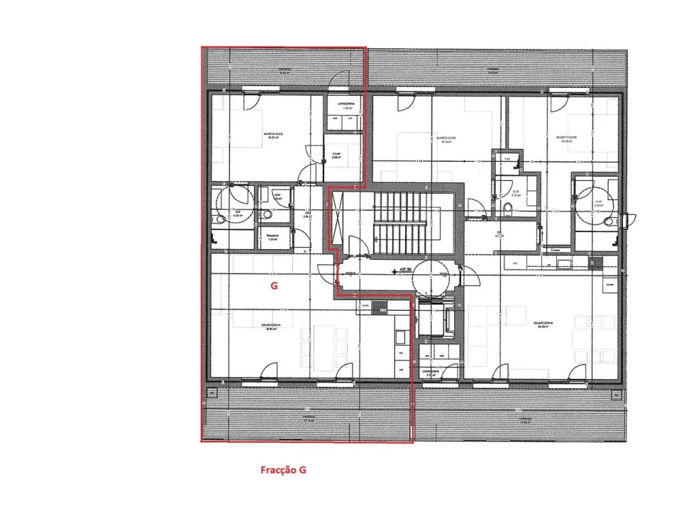 (G) É um apartamento novo com 80,31m2 de área bruta, composto por 1 quarto tipo suite com closet; 1 casa de banho completa; 1 lavabo; cozinha; despensa; sala; corredor; lavandaria; varandas em todas as divisões com 9,38m2 no quarto e com 17,15m2 na sala; terraço no topo com 71,26m2; um lugar de parqueamento.