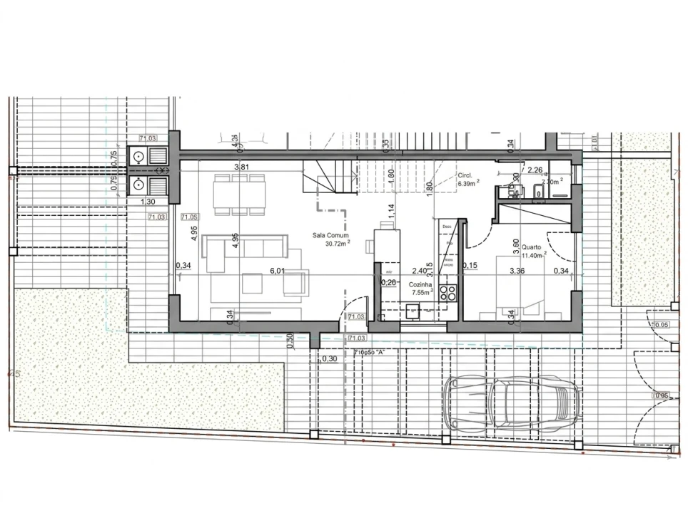 No piso térreo encontra uma ampla zona social em open space, com cozinha com península totalmente equipada, uma casa de banho completa e um quarto com roupeiro.