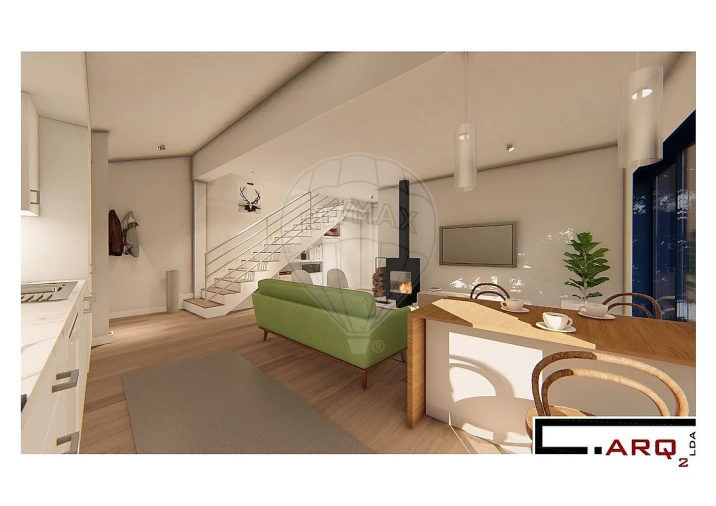 O projeto contempla a seguinte configuaração, no rés-do-chão podemos encontrar uma sala com lareira e cozinha em open space, um quarto e um wc completo.