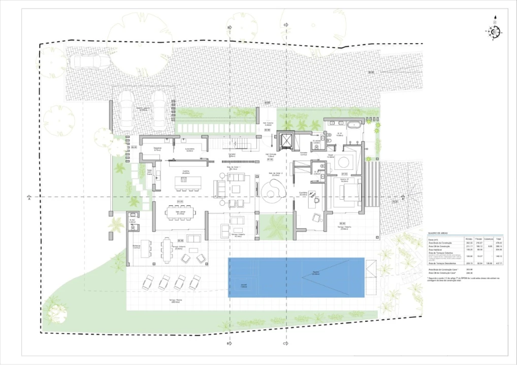 O nível do porão desta propriedade excepcional possui uma garagem para três carros, um vasto espaço aberto com possibilidades infinitas de uso e uma zona técnica conveniente. Com um tamanho total de terreno de 3000 metros quadrados, esta vila oferece amplo espaço ao ar livre para desfrutar do clima idílico do Algarve.