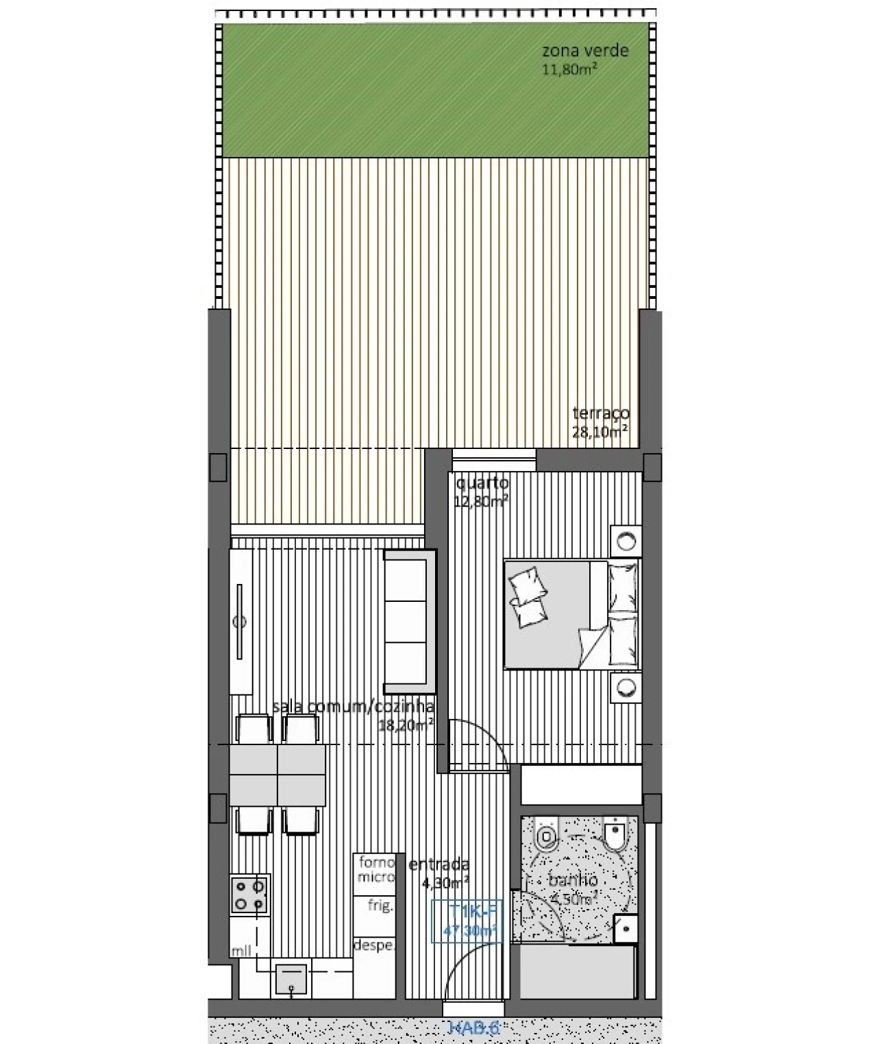 Apartamento T1 com terraço e jardim.