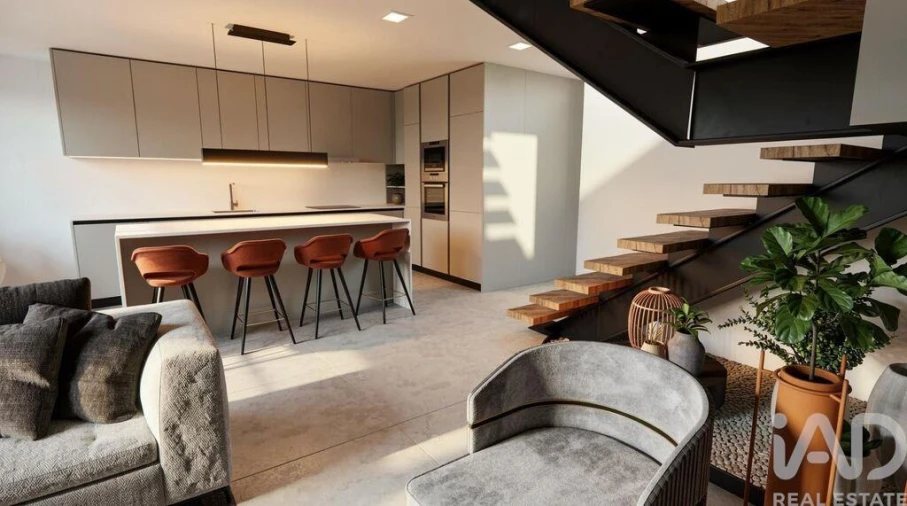 No rés do chão, encontra uma ampla e luminosa zona em open space com 46 m², que integra sala de estar, sala de jantar e cozinha totalmente equipada, proporcionando um ambiente moderno e acolhedor.