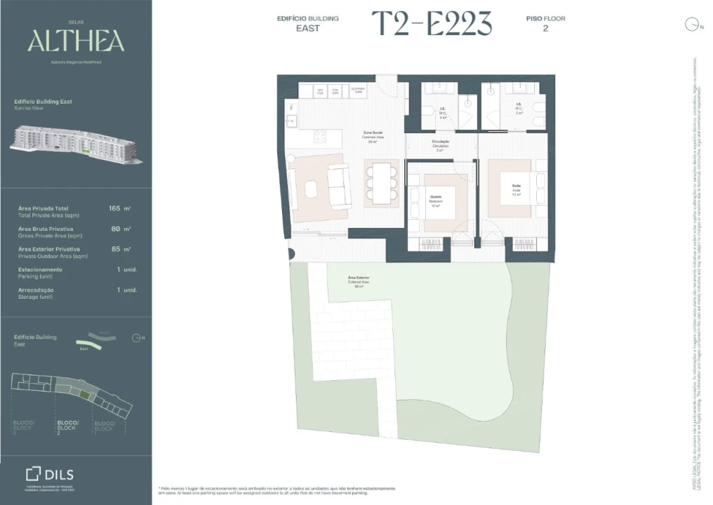 Apartamento T2 com 79 m², varanda de 85 m² e 1 lugar de estacionamento, inserido num novo empreendimento a nascer no Belas Clube de Campo, inserido em paisagem verde, junto ao Belas Golf Course.