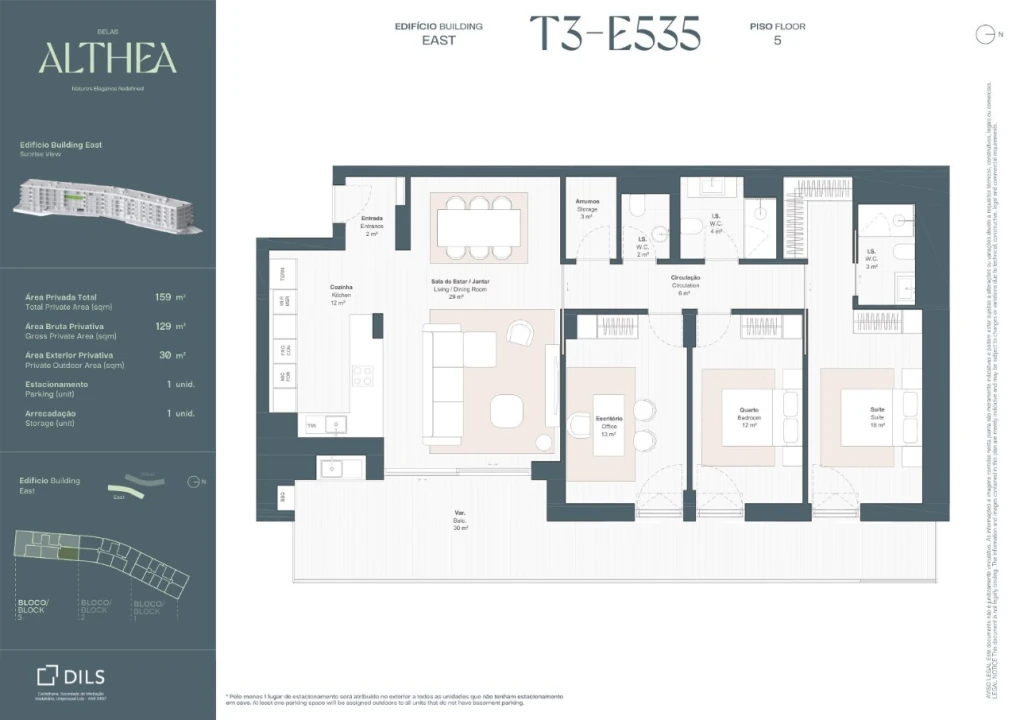 Apartamento T3 com 129 m², terraço de 31 m², arrecadação e 1 lugar de estacionamento, inserido num novo empreendimento a nascer no Belas Clube de Campo, inserido em paisagem verde, junto ao Belas Golf Course.