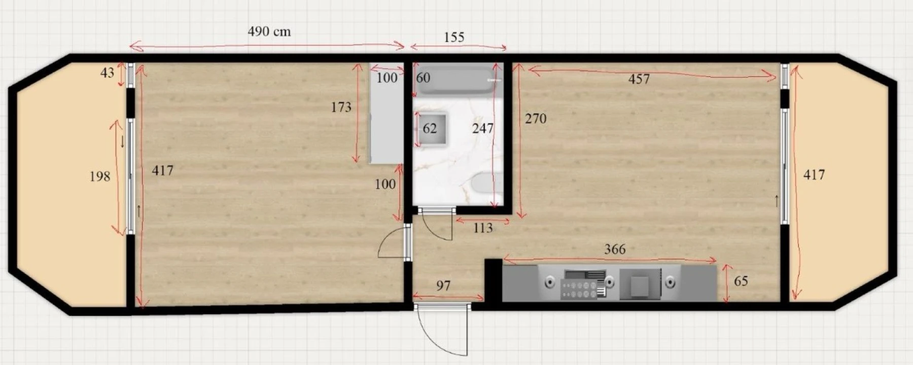 Composto por hall de entrada com, wc completo com banheira, cozinha totalmente equipada em open space com sala orientada a poente e com acesso a varanda, e quarto com roupeiro orientado a nascente.