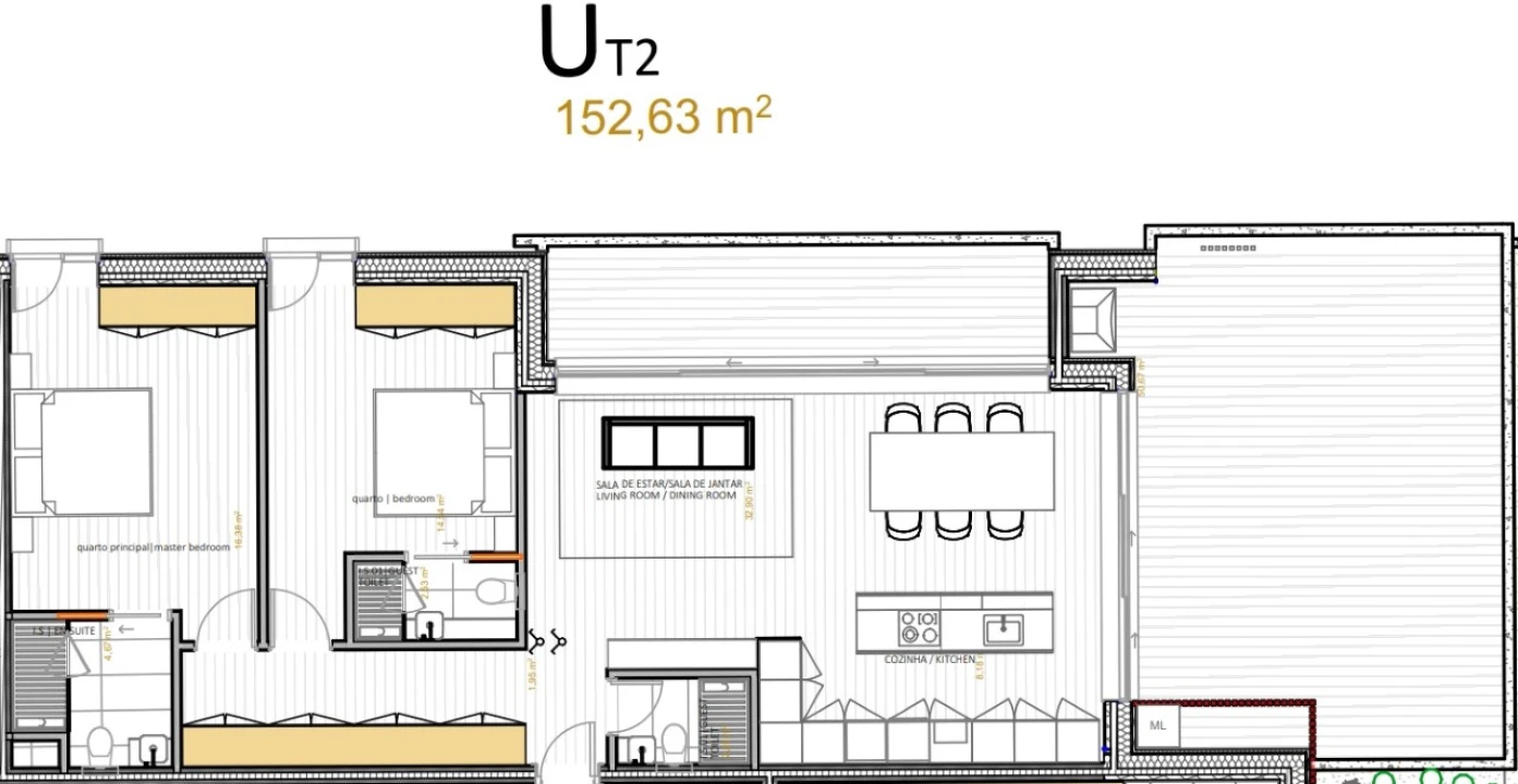 Apartamento T2 composto por Sala em openspace com varanda, duas Suítes com varanda individuais. Tem ainda um lugar de garagem