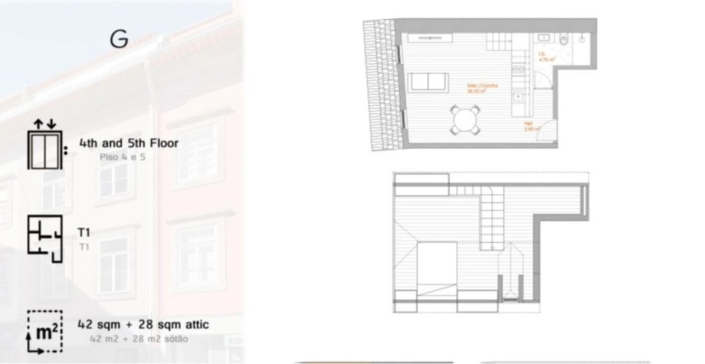 Apartamento T0 DUPLEX bem no Coração da Cidade do Porto com cerca de 70m2 divididos (42m2 +28m2) ao nível do quarto e quinto piso.