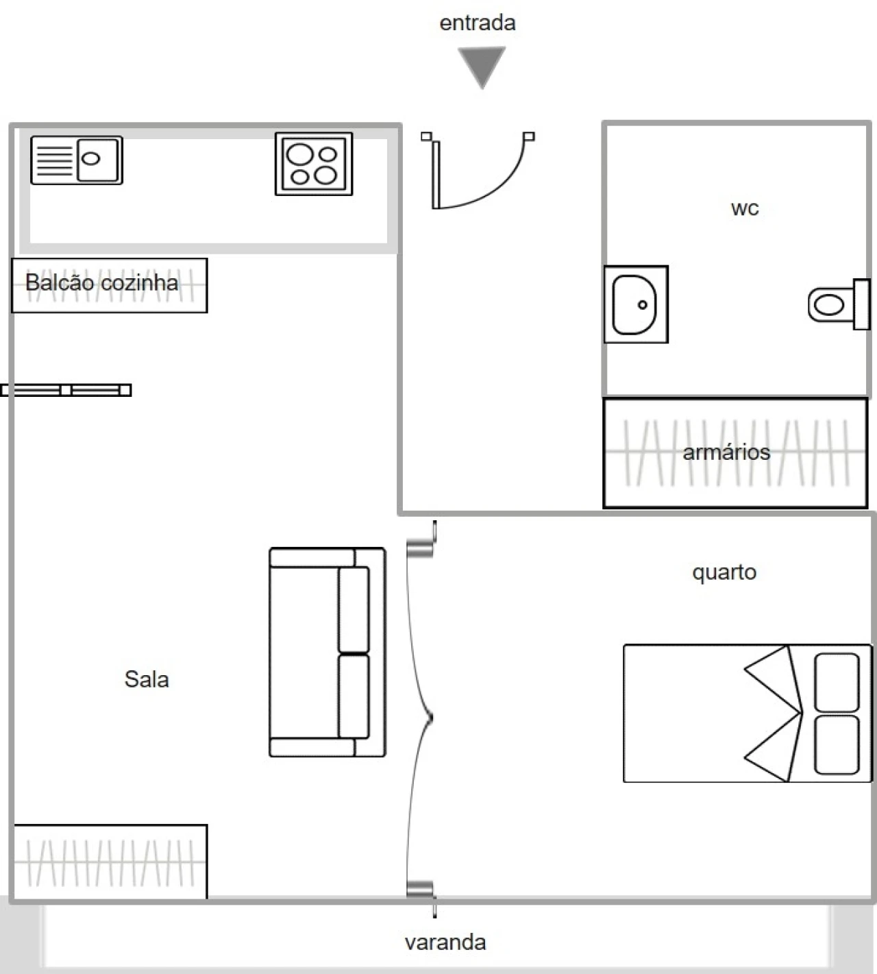 Apartamento muito simpático com uma hall de entrada, uma sala com cozinha em open space com micro ondas, exaustor, frigorífico, forno, placa e um balcão para as refeições, tem uma boa casa de banho completa e um bom quarto com armários embutidos com portas de correr a dar para a sala, ou seja, quando as portas estão abertas torna-se num open space total, quando se fecha fica com um T1 com um quarto totalmente independente, tem uma varanda a dar tanto para o quarto como para a sala