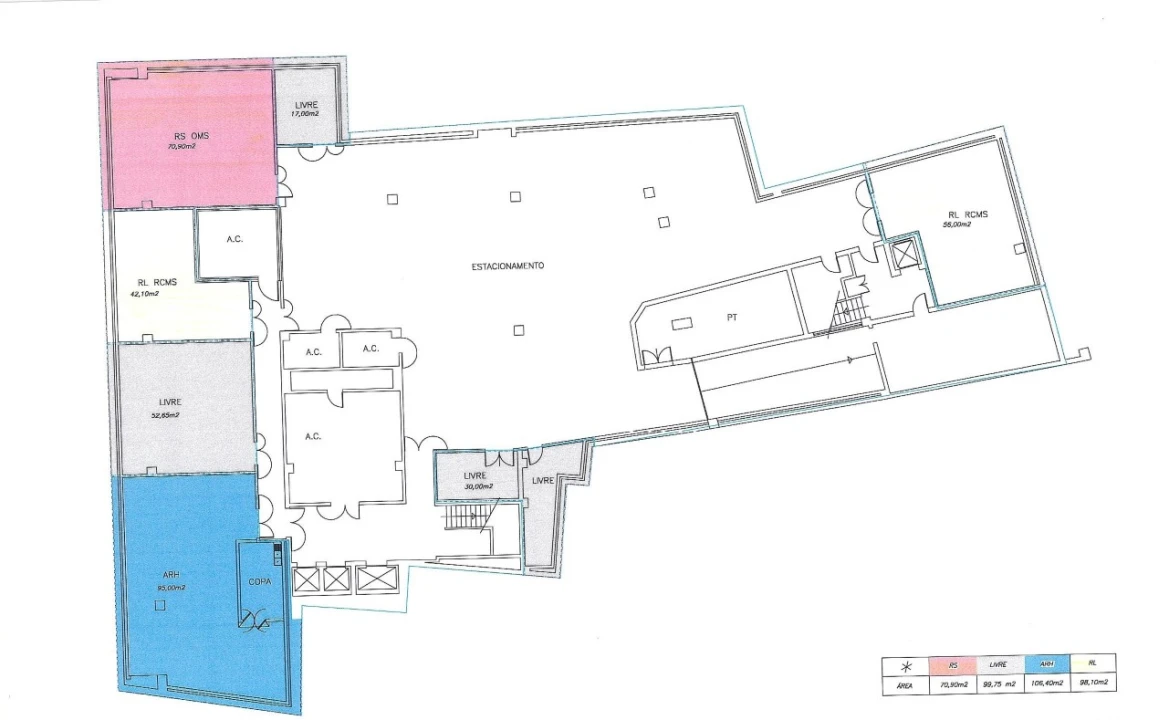 O R/C é destinado a serviços, tendo já contemplado divisórias, casas de banho (masculinas e femininas), receção e diversas salas/auditórios e arquivos.