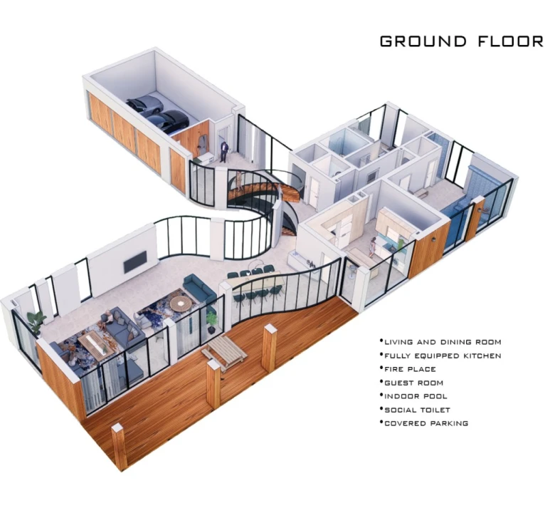 As zonas sociais e de lazer estão em contacto com o exterior com espaços de estar cobertos e descobertos. A zona de refeições e cozinha estão ligadas a uma zona exterior. onde se encontra a piscina apoiada por zonas de estar.