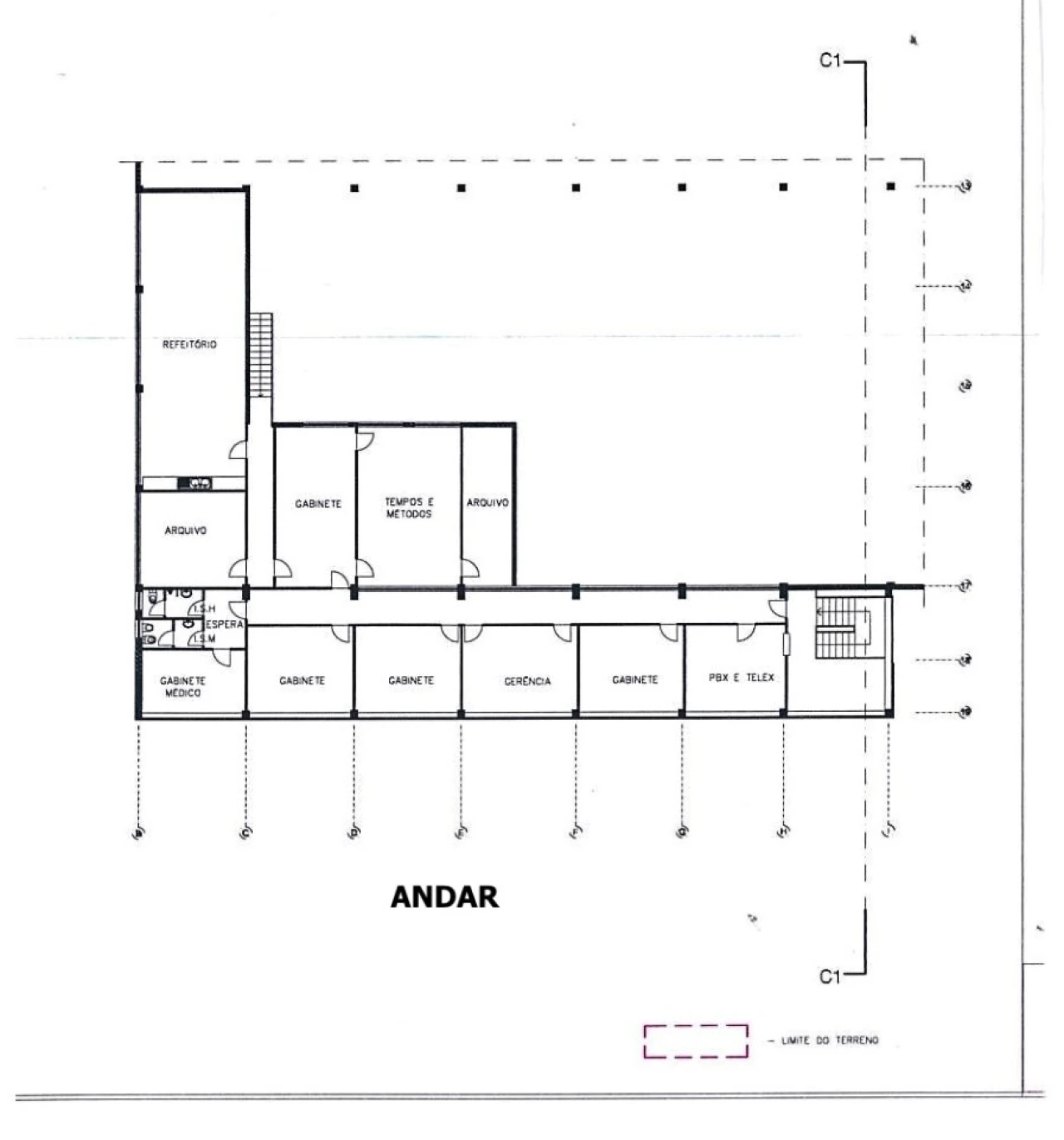 O piso superior conta com 377m2, onde se situam os escritórios, refeitório, gabinete médico, etc.