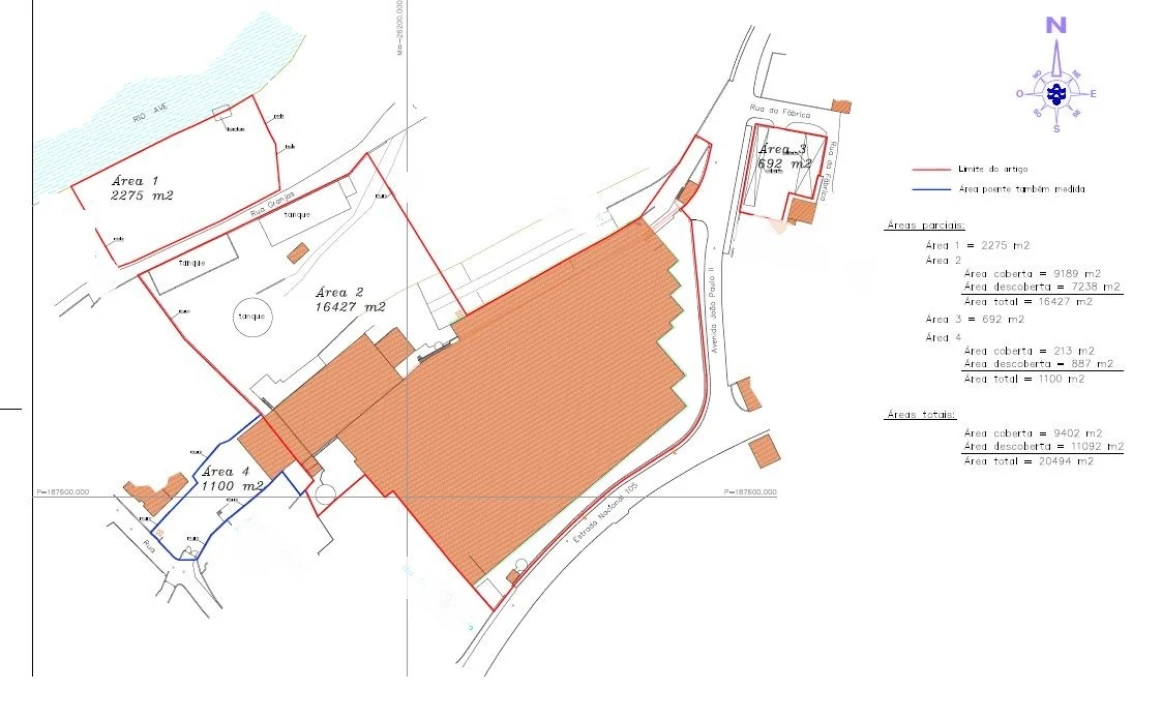 A nave principal ampla com mais de 5.000 m2. Restante área, com pavilhões secundários e menor dimensão, área de escritórios, balneários e outras áreas e construções de apoio à unidade Industrial.