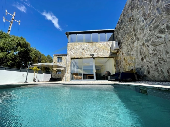 Moradia rústica V3 situada em Alcoitão, totalmente reabilitada, revestida por fachada de pedra.