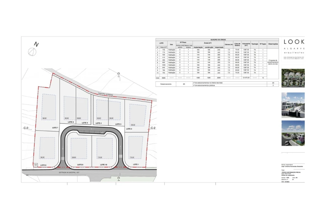 O lote nº2 tem 775 m2 de área com uma implantação até 184 m2 e uma área de construção total de 184 m2.