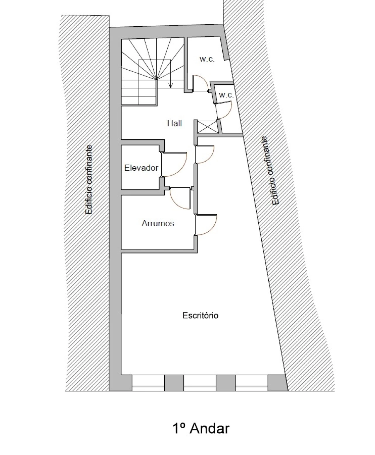 O imóvel em questão conta com uma sala, duas casas de banho e um arrumo que perfaz todo o 1º andar. A entrada faz-se pelo R/C com acesso ao interior do prédio, que permite aos clientes entrarem no prédio e ter acesso à casa de banho e sala de reuniões partilhadas que também se encontram no r/ch.