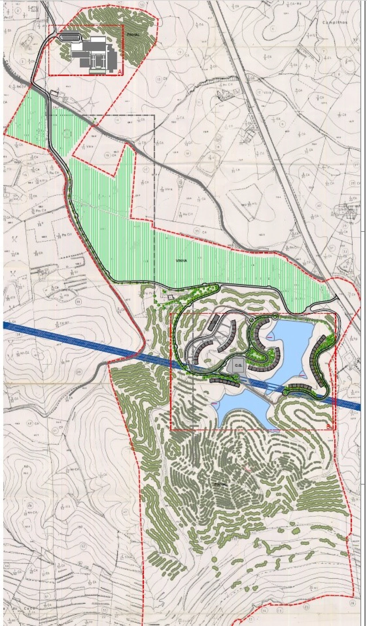 O edifício principal do hotel estará implantado numa parcela plana de cerca de 6hecatres no extremo norte da propriedade servida por uma via pública já existente na extremidade norte da propriedade que interseta diretamente no IC1para cargas e staff, e ficando a entrada principal dos hóspedes noutro caminho também acessível pela IC1 mas este último provado e atravessa a propriedade na sua parte central até intersetar com o outro caminho público a norte.