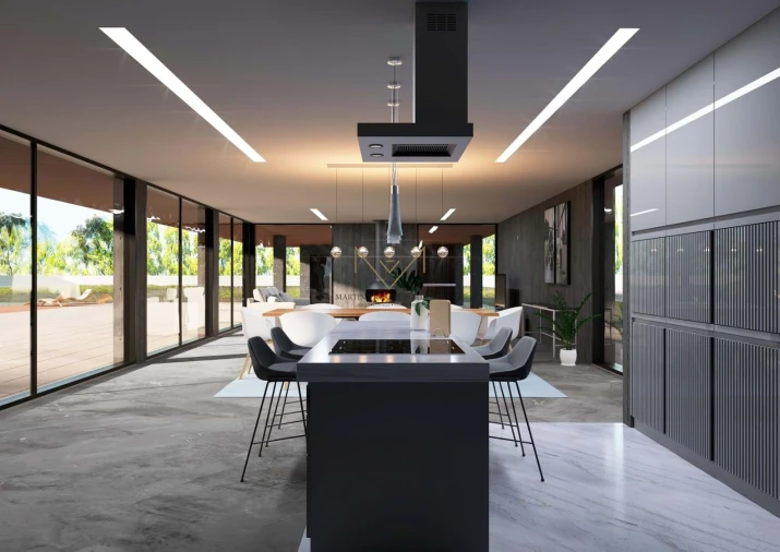 Encontra grande Hall entrada a com uma magnífica escada espiral e 2 suites, 1 sala tv/bar e lado oposto uma cozinha em open-space com uma sala de 60m2 e uma dispensa enorme.