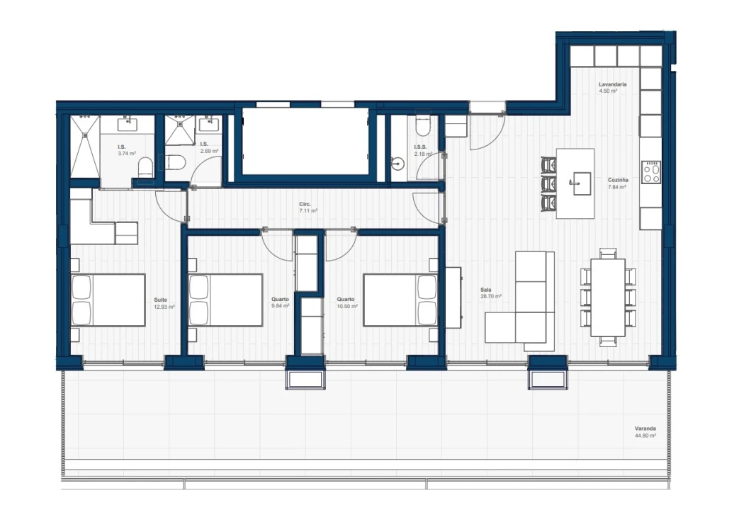 - Varanda com 44,80 m2;