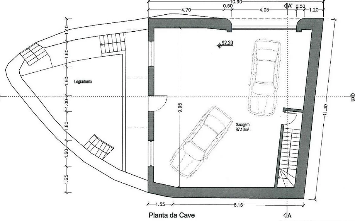 Tem um projeto de construção para moradia V2, constituida por dois pisos: sendo a cave destinada a garagem (87,10 m2) e o R/C destinado a habitação composto por: dois quartos (16,50 m2 e 16,05 m2) tem um com varanda (4.50 m2), uma área de circulação com 5,45 m2, uma cozinha (11,35 m2), uma despensa (5,70 m2), uma casa de banho (5,30 m2), uma sala (27,20 m2) com a respectiva varanda (4,80 m2) e um hall 2,05 m2.