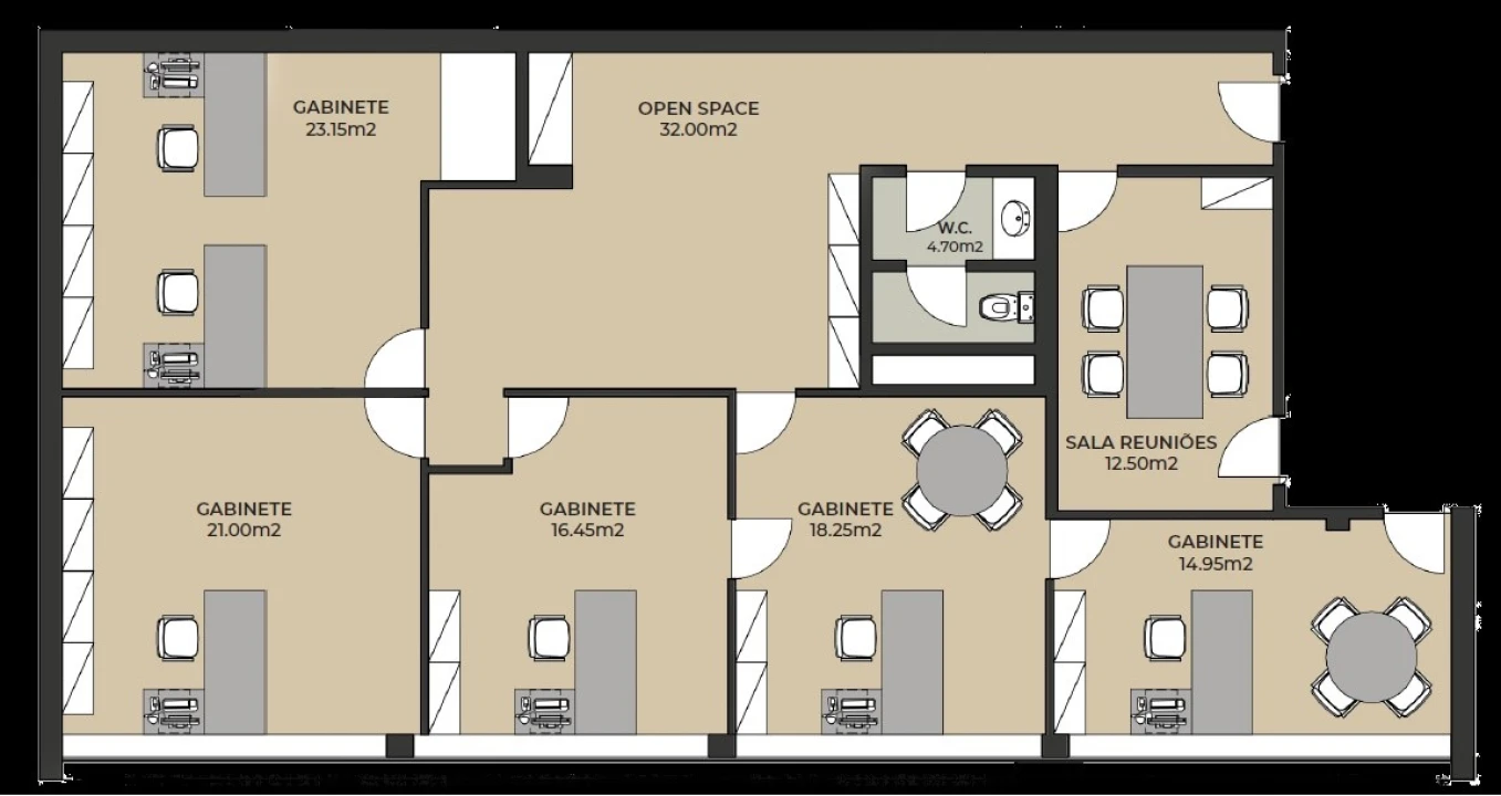 Estão disponíveis, para arrendamento, 2 espaços comerciais com diversas salas individuais, sal de reuniões e casa de banho privativa.