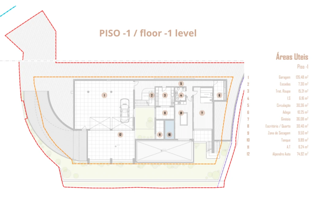 - PISO -1: garagem e alpendre auto para estacionar 6 viaturas, jardim, escada de acesso ao piso 0, lavandaria, instalação sanitária, adega, ginásio, quarto/escritório, compartimento técnico da piscina e tanque de compensação da piscina;