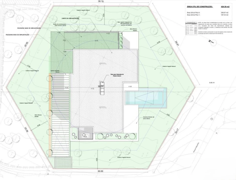 No piso térreo, com pé direito alto, duas suítes tendo uma das suítes zona de closet, sala principal com janelas de sacada, casa de banho social e cozinha. Toda a zona social tem acesso ao alpendre e jardim com piscina. No piso superior, três suites e uma master suíte com 144,93m2 que inclui uma varanda de 69,90m2 com vista sobre o jardim com piscina. A garagem tem espaço para quatro carros, um espaço de arrumos, casa de banho, casa de máquinas e um jardim interior de 30m2.