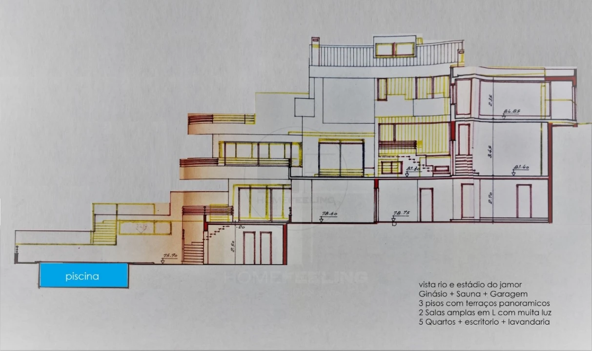 Moradia composta por duas salas duplas em dois pisos diferentes, 1 escritório, divisão cofre, cozinha com lavandaria, 5 quartos, ginásio e sala de jogos, piscina, jardim e elevador.