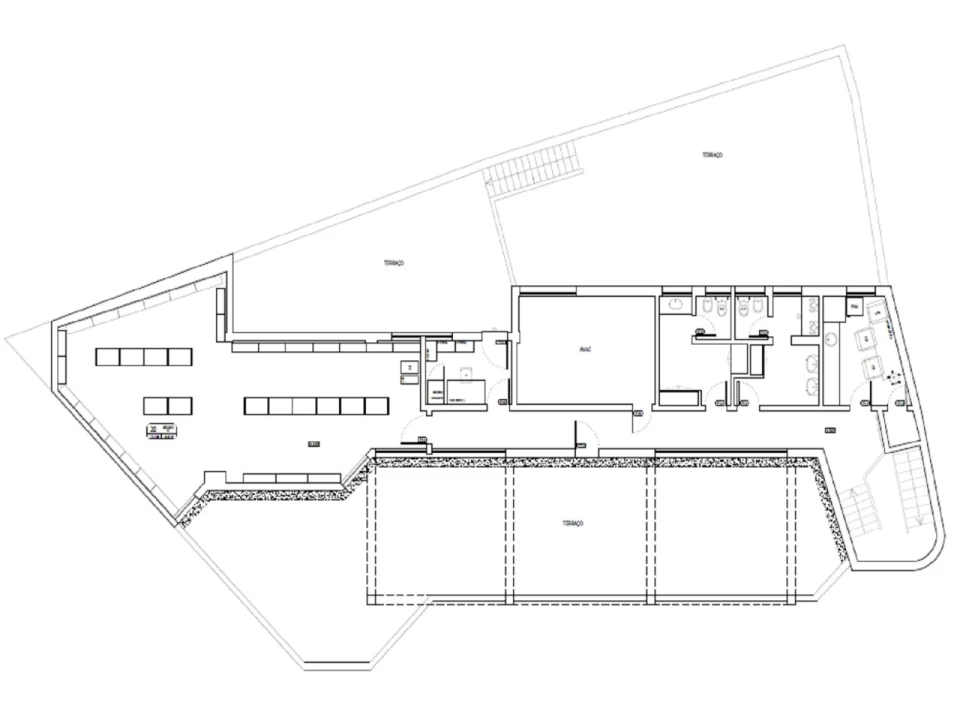 R/c - Hall de entrada, espaço amplo, sala de reuniões, gabinete, instalações sanitárias e sala arrumos.