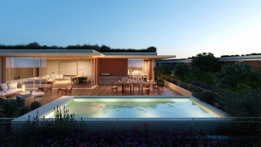 Distribuído por dois andares, o duplex conta com cinco quartos (três deles em suíte), uma sala de estar e jantar com design contemporâneo e janelas de corpo inteiro que deixam entrar abundante luz natural. No rooftop, rodeado por vegetação e jardins suspensos, encontra-se uma piscina privativa e zona de lazer perfeita para receber com estilo.