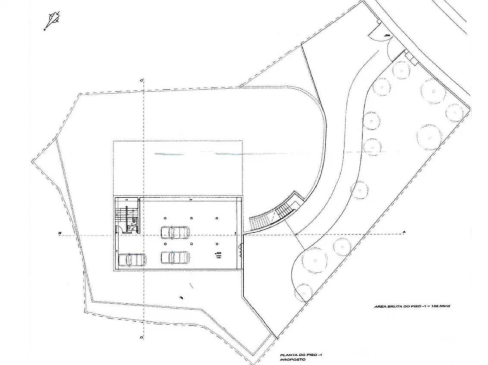 Na cave - uma garagem fechada com capacidade para vários carros, casa de banho e acesso ao rés do chão.
