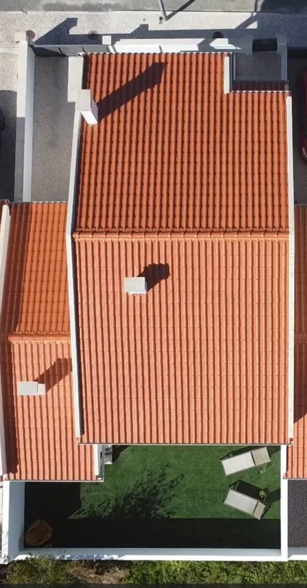 Espaço exterior: Jardim traseiro privado de fácil manutenção com um terraço coberto e área para churrasco, levando à garagem e cozinha